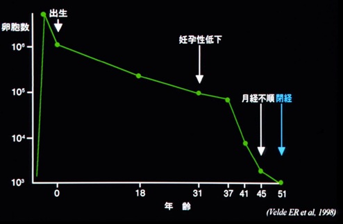 女性の卵巣に存在する卵胞の数は生まれたときは200万個ありますが、次第に数を減らし、 女性は37.5歳を過ぎるころには10万個を切るようになります(図)。そのころから卵巣機能が衰え始めます。そして、まず現れるのは月経周期の短縮です。通常28日周期の女性が、次第に月経周期が短くなり、25日を切るようになってきますと、多くの女性が、のぼせ、ほてりなどの自律神経失調症状を訴えます。その期間には、月経の短縮以外にも、無排卵性月経とよばれる状態になって不正出血がなかなか止らない、ということもしばしば見受けられます。その後、周期が徐々に長くなり、ついに月経が永久に停止した状態を閉経と呼んでいます。通常45才から55才までに閉経し、この時期が更年期の時期に相当します。このころの不正出血は更年期のホルモンのバランスの乱れによることが多いのですが、なかには子宮がん、特に子宮体癌による出血も見られることがありますので、放置せずに女性ホルモンを専門にする産婦人科医師のいる病院を受診し、検査してもらうことが必要です。また、現在のホルモン環境を確認するために、女性ホルモンを測定します。卵胞刺激ホルモン(FSH)が上昇していることが確認されると、閉経時期が近付いてきていることがわかります。但し、この時期の女性ホルモンは乱高下を繰り返していますので、一回採血しただけでは正常値が出てしまい、「大丈夫だね」と見逃されることもあることは注意が必要です。更年期の症状は人によってさまざまで、早い人では40歳を過ぎたころから始まりますし、遅い人は50歳を過ぎても通常の月経を認め、何の症状もない人もいます