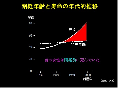 昔の女性の寿命は更年期を迎える前に終わっていた(図の引用:「更年期からの輝き(小池浩司著)」)。この事実は人類も含めた多くの霊長類の寿命の研究から明らかにされています。