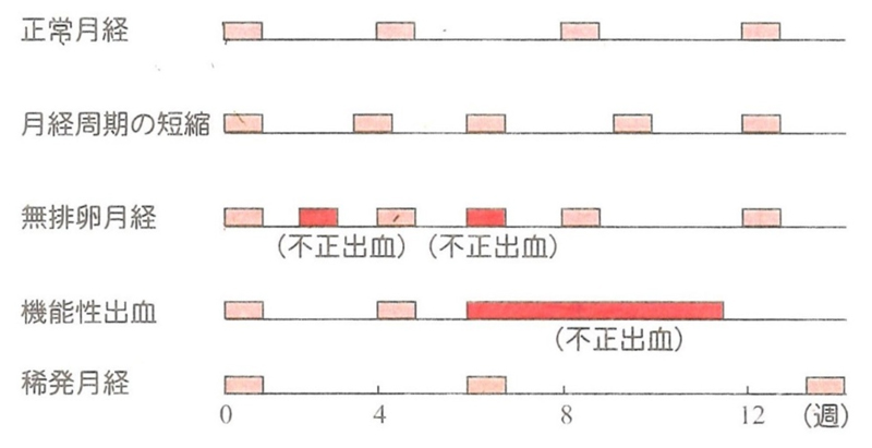 A 老化現象により女性の卵巣機能が衰え始めると、様々な月経周期の異常が認められます。まず、月経周期が短くなってきます。また無排卵性月経と呼ばれる状態になると月経と月経の間、つまり中間期に不正出血がみられます。この不正出血はなかなか止らない事があり、10日以上続くこともしばしば見受けられます(こうした状態を機能性出血といいます)。その後、周期が徐々に長くなり(稀発月経といいます)(図参照「更年期からの輝き(小池浩司著)」より)、そして遂に月経が永久に停止した状態を閉経と呼んでいます(一般に一年以上月経が来ない状態が確認されたら閉経と診断します)。通常45歳から55歳までに閉経しますので、この時期が更年期の時期に相当します。